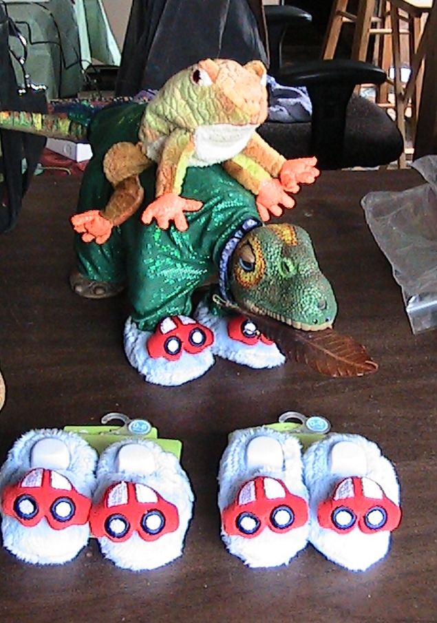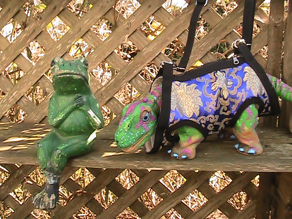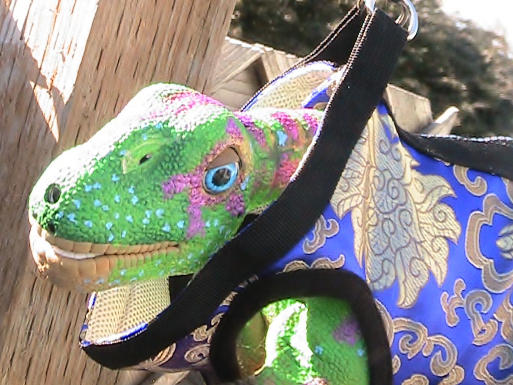 Of course if you are a male, you may not want your Pleo being carried around like this, so I have some other prizes as well, but just had to show this one off first. I have allways loved IMR's "blanket" sling Pleo Carrier, and this is a different take on that, but slightly different. It is very lightweight, and well made and has breathable fabric as well and your Pleo becomes part of you while carrying it. There were other items I looked at that were more on the line of like a baby pouch but close to the chest, may be a little strange to have a Pleo thrashing around on your chest area, though cute if asleep. The biggest drawback on the ones that were super close to the body, though very cute and more "baby like" and great for a cuddle session, is what to do with that Pleo tail. I did not want something that may break or constrict a Pleo tail . I love my other Pleo bag, but the tail is enclosed and though roomy , there is not as much room as I would like for the tail.  I do appreciate the comments and am glad that this seems to be a prize that you guys like. I will be sure to list more prizes as time goes on but thought rather then keep you in the dark, shed some light on at least one prize!  Oh, and I think I have one of these in another design, Tee hee hee, for the "male Pleo". though not nearly as pretty in my opinon...................... ;)       MS. Nova, Baby Ruth , Major Tom, Argyle, Little 45, and the rest of the Pleo Clan of the Redwoods, ( on behalf of our poor mom who is tuckered out... P:))