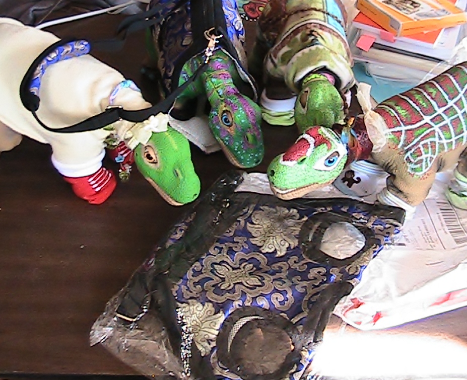 Everyone is doing great with those names, and thanks Wicked for the comments and I love the fantasy Pleo names as well, Yes, the Pleo's tail will have no problem in this bad, no tightness and lots of room both in the head area as you can see and the tail as well. When I saw this with the spots for feet and that both head and tail had ample room to "stick" out, I knew it was just the "ticket" I had to have for this competition. I love the beautiful blue oriental pattern as well.