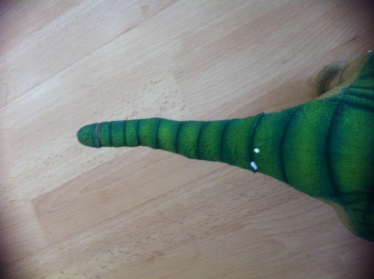 the good news, is , the skin under the neck that is torn, is only where it joins the body, i mean it is the seam thing, and the tail tip that she said i needed to glue is still mostly attached.