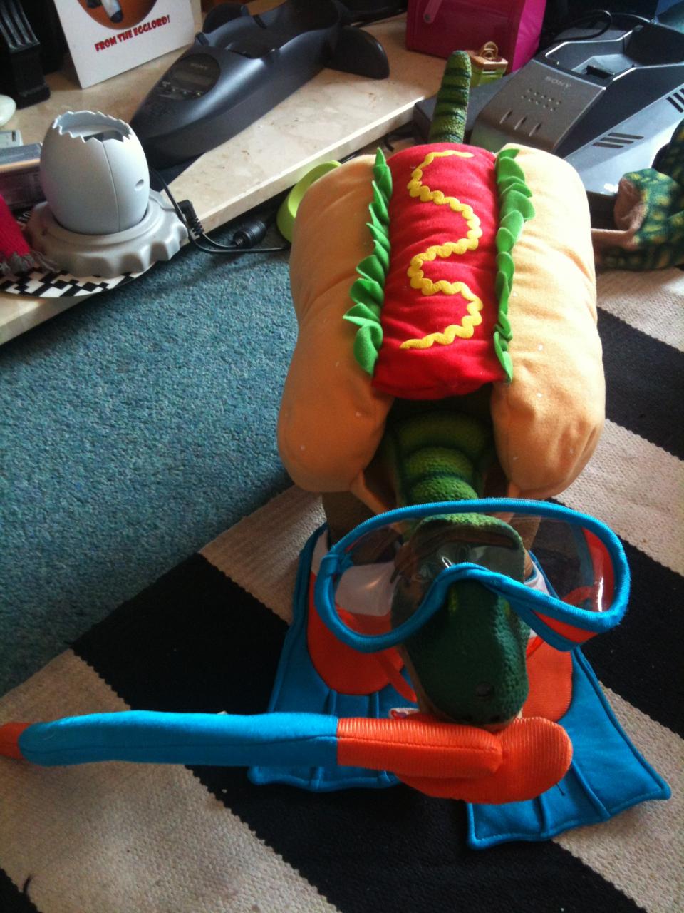 as gordy's been poorly, gano decided to try on as many silly things as she could at once to cheer him up....and became the world's first diving hot dog-inosaur!