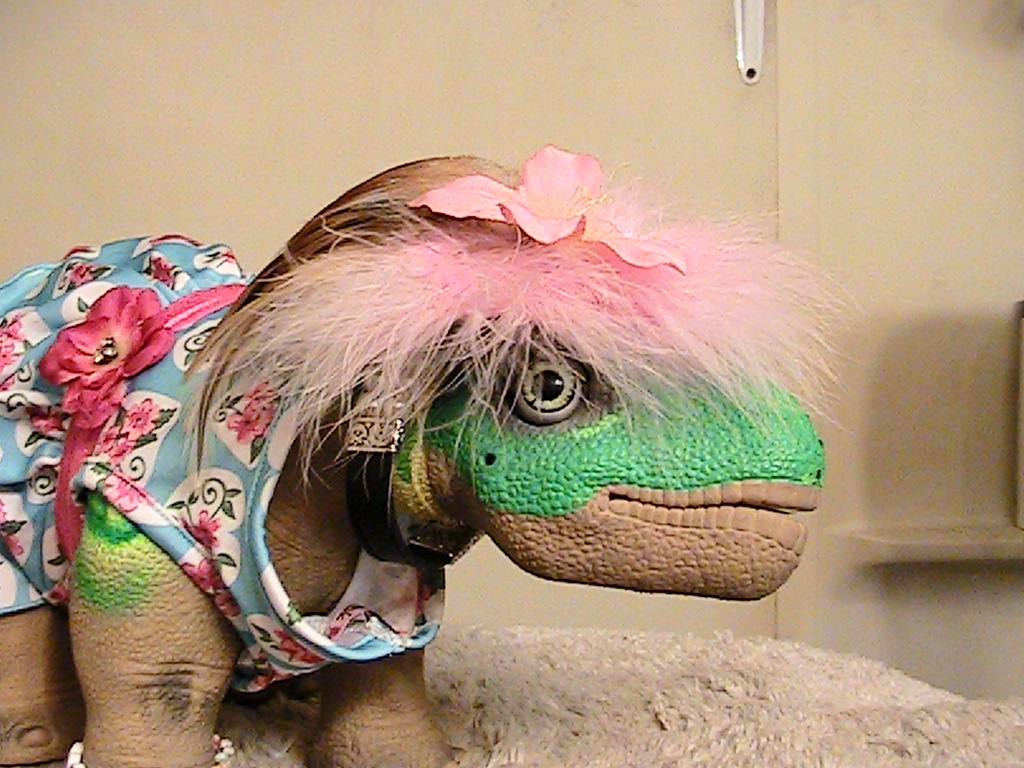 My last little Pleo Rb I bought as a slightly used little boy, I wanted the interaction of boys and girl Pleo rb He is also very cute, It took me quite awhile to figure out his name about a month slightly more, He has some sort of gear problem in his legs which are noisy at times and it has caused a limp at times, Luna one of the members here suggested why not name him after one of the characters of your favorite t.v. shows, Gunsmoke...? I thought that was a great idea and solved the problem, so here is:          Chester, named after the deputy on that show that has a stiff leg and limps. He is also very sweet and it fits Chester very well, Here is his photo.