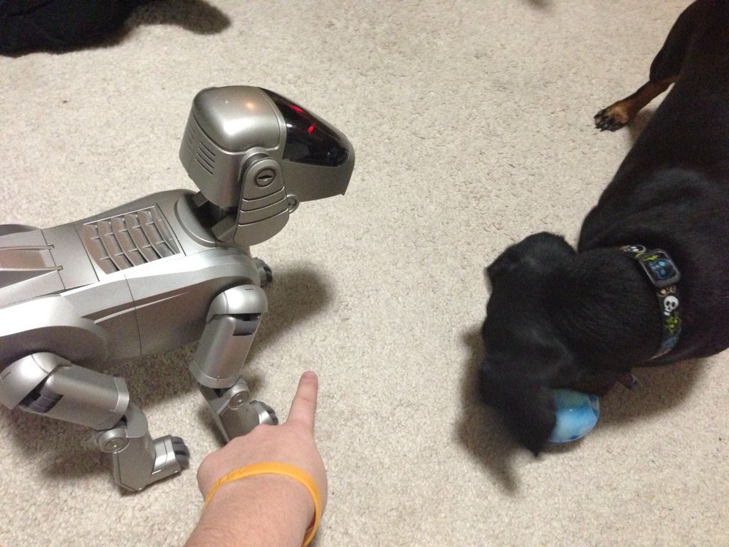 Cutest thing I have seen in a long, long time!  Your dog(s) are adorable.  I wish I had an Aibo, I would certainly let them play together with bio dogs.