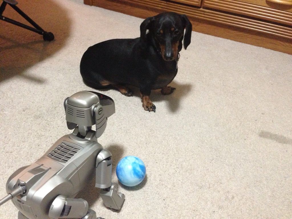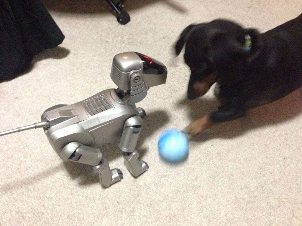 Thank you :)  I find that most bio dogs are afraid of Aibos.  I am glad Ratchet seems to get along with them.  Our other dog, who is a golden retriever, is terrified of them.  Ratchet is also weary of the Pleos and my larger robot NAO.  I hope to write an autonomous progam for NAO so that the robot will toss the ball to Ratchet and track it to get it back from Ratchet.