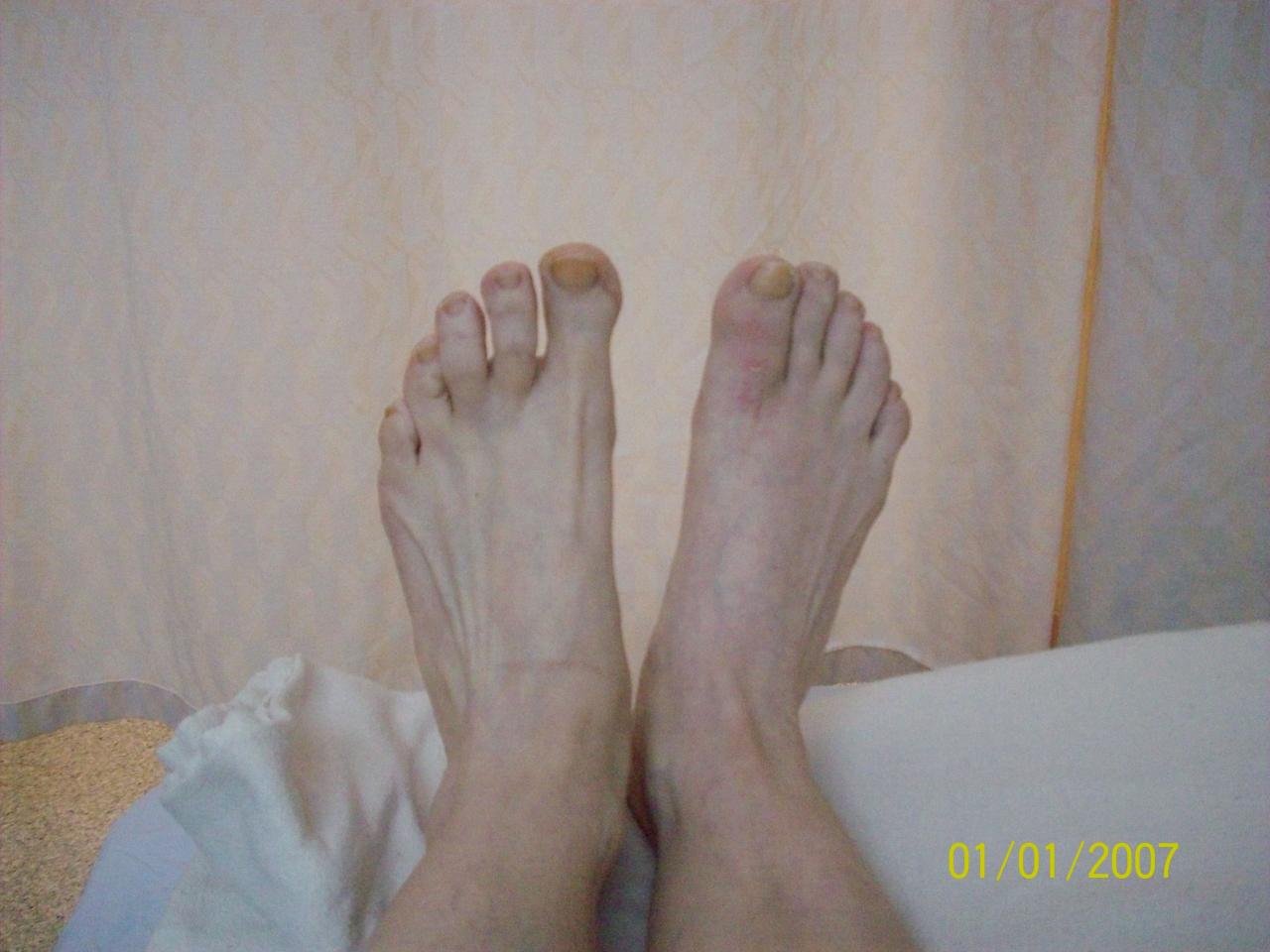 In 2007 when another dr. did a bunionectomy on this foot, he overcorrected, making the big toe point away from the other toes, so it actually pointed towards the other foot. This is called, Hallux Varus and is an uncommon complication but does occur when a dr. overcorrects. This is why I have the dr. I have now, cause the original dr. overcorrected and I got a second opinoion. The dr. I have now could not fix it with what is called a Joint salvage, so he had to do a second operation called a fusion of the big toe where I have a titanium plate and five screws, This was fine till I fell down stairs late at night right before Christmas and both severely fractured and dislocated the big toe. So the operation I had July 23rd was to fix this fractured toe that never healed and also my little toe which is both a tailor's bunon and a Hammertoe. Very painful.