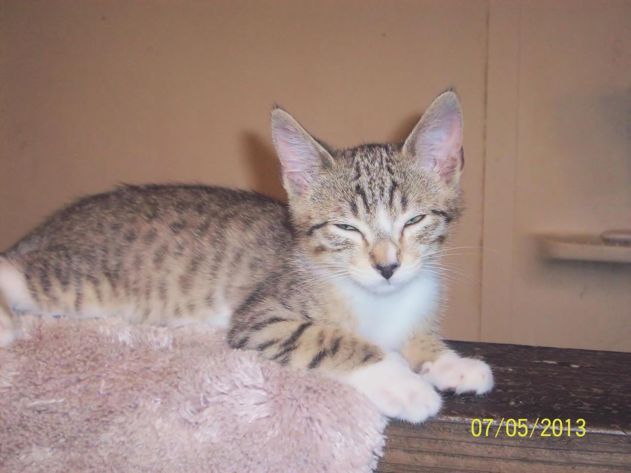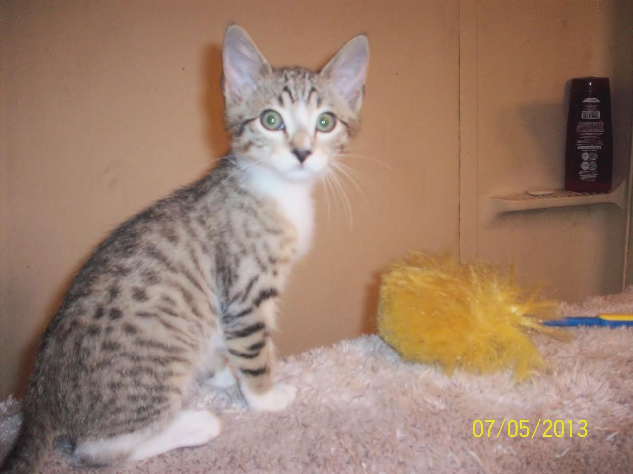 He is gorgeous, and has the most unusual markings. He has some stripes, but beautiful spots on his sides and a long tail with a kink at the end of it, just like our tortie kitten, Fuzi. ;) He was born about ten weeks ago, but is still small. He goes for his first shots on Monday and his check up, he has been wormed and had advantage, but until he gets his first vaccine, he has to only look at the other cats and dog through cage walls. He is a fur ball , all purrs and as sweet as can be.