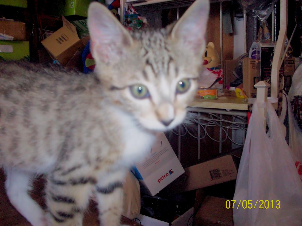 My friend told me about a month ago, Xena  disappeared. :( She was very friendly and she was taken by someone. I felt bad for Xena, but perhaps the person or persons that took her will give her a better home, I know I was warned not to let this guy out or the same thing will happen. The older he gets his spots and markings should get darker. I would love to see more photos of Kleenje if you can get more sometime, a side view or standing up view would be great. I can tell he looks very laid back and sweet like you said.              Karuna and I thank you. I will have to post more photos. He had his first kitten check up and vaccinations on July 7th, and they said he looked great, very healthy, and about 9-10 weeks old. He also was put down in their records as Bengal X, so they could tell by looking also!              RWM :)  I will see if I can find a photo or I have a short video I took last summer of Xena when I took my pleos to my friends house .