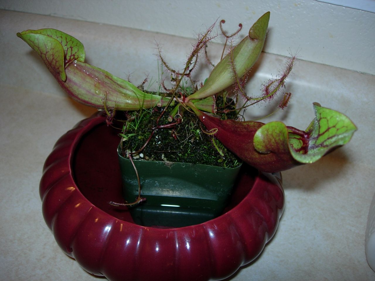 My newest addition to the family. Seymour and his friends are all having dinner. The shiny thing dangling from the middle plant, is a live fly. In one of Seymour's tubes is a fly. Another one has an ant or nat. Pretty Cool! 8)
