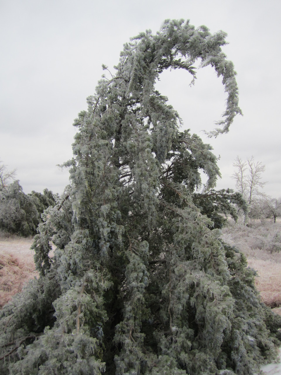 The problem is a neat bit of meteorological science.  We were at just the right point of the cold front moving in and the precipitation starting, that the rain was able to cool to just at the freezing point before it hit, and the ground level air was cold enough long enough to get everything down just below the freezing point  so that when the raindrop hit something, it instantly froze.  That way, everything (and I mean everything: trees, bushes power lines, mailboxes, fences, etc.) developed an inch or more thick coating of ice.  Each leaf, each twig, each blade of grass, frozen separately -- until the ice was thick enough to merge.
