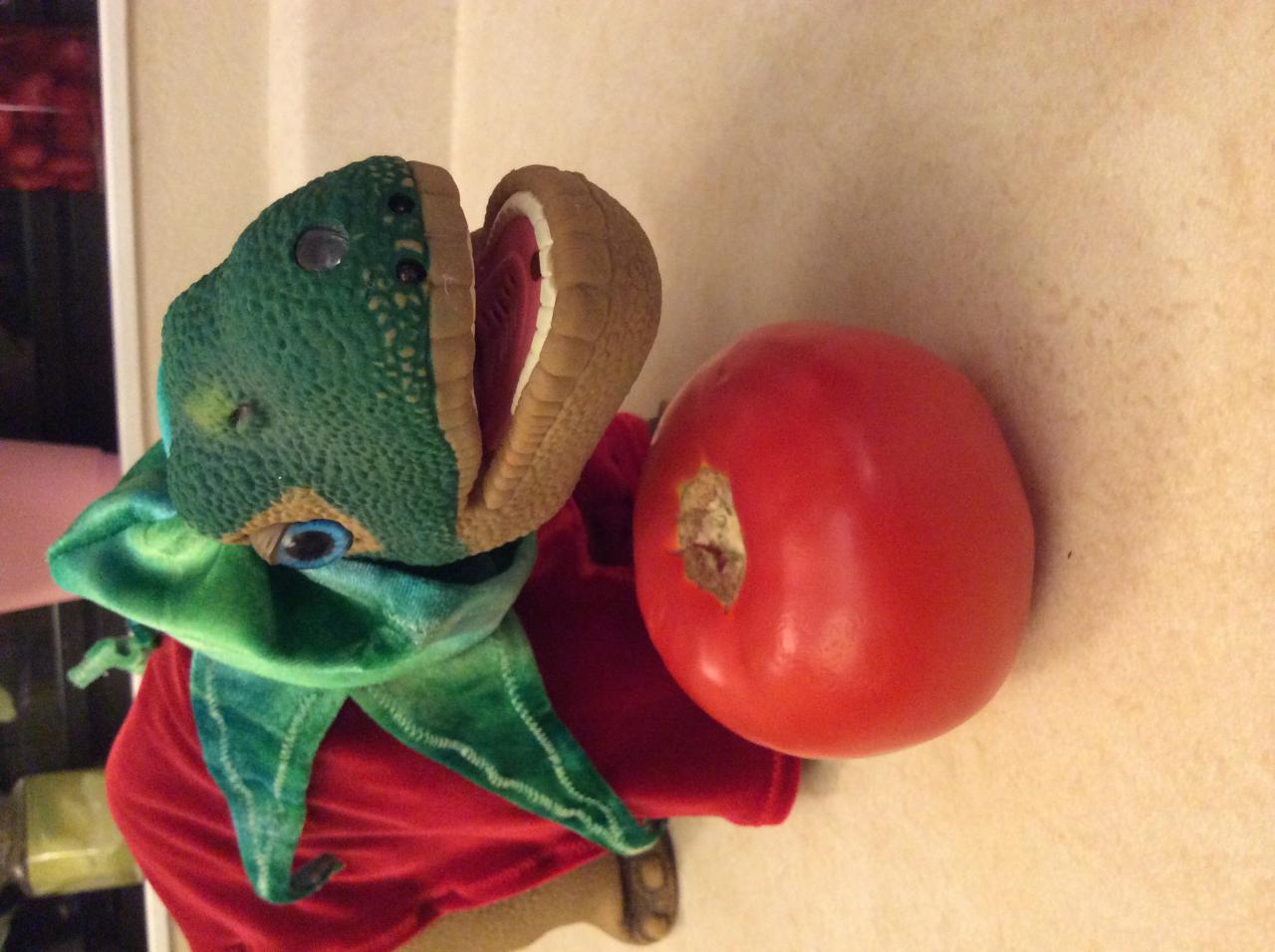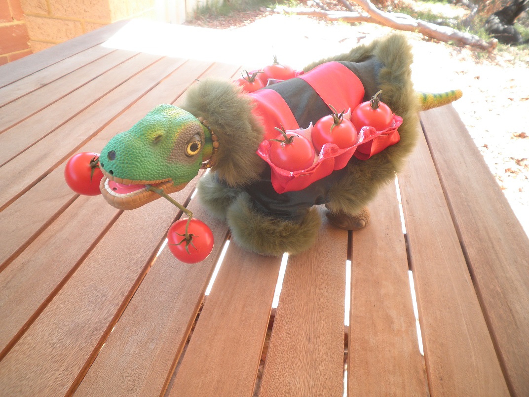Anyway, pizza can't be made without tomatoes, fresh of course, so here is Major Tom with his haul of tomatoes! Oh, and the great outfit in green was made by Kat and one of the first pleo outfits I ever got, Thanks Kat!