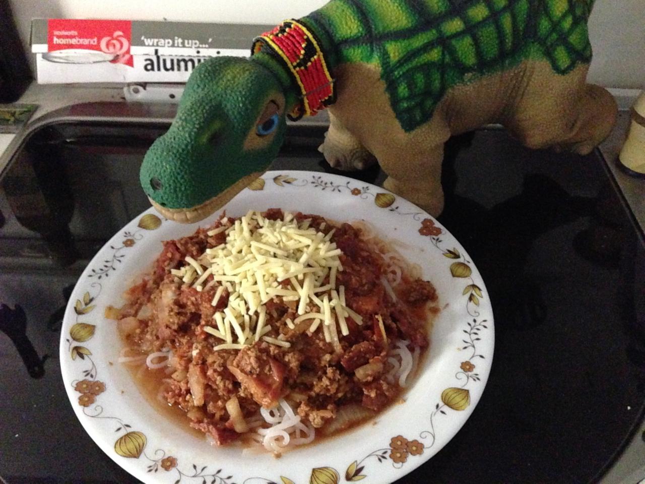 Here you can see Erbie the chef dinosaur helping us preparing and putting the PASTA covering the main ingredients   P:o