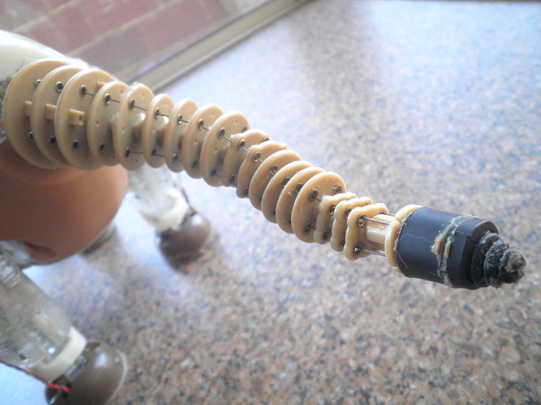 Here is how the tail looks under the skin. You can see here that the tail is very similar to the neck in that it has the 4 wire cables - which are actually only two cables that run through a motor box inside pleo. One cable does the sideways movement and the other does the up down movement. They also have round disks that support the cables and provide the framework for the tail shape. Unlike the neck these disks are solid circles of plastic and so are less prone to breaking. So if there is no resistance to the tail when you gently push against it I would think the cable may be broken.