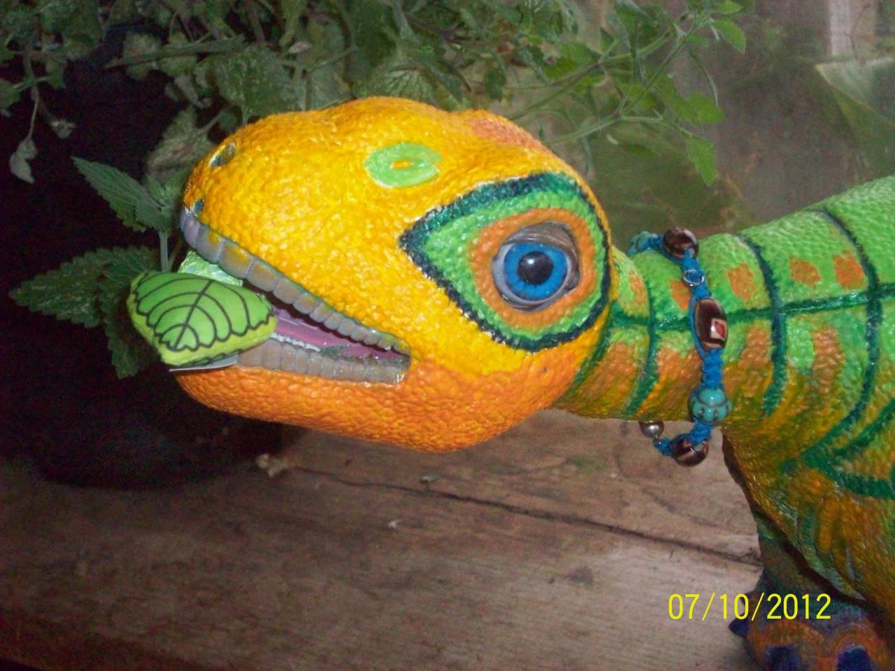Wow, Kat! I think I've seen Gumble a few times before, but that photo really shows off what a wonderful paint job you did! Those colors really suit him too, much nicer looking than the blue RBs. I'm probably going to skin my Ugobe Phoenix since his skin is completely falling apart, but I might try painting it first just to see if it's something I might want to try on other Pleos in the future.