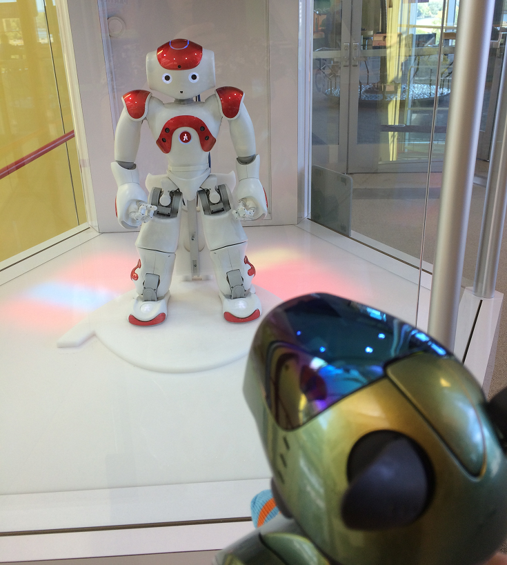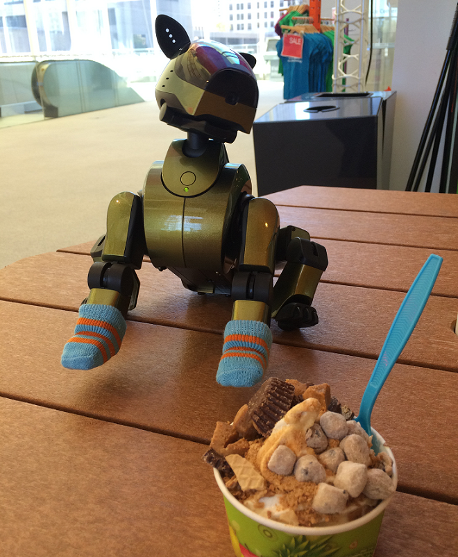 I'm planning on bringing him with me to visit a local science center tomorrow if I have time and will post photos and stories of our adventure afterward (this same center is used to me bringing in Aibos and Pleos on a fairly regular basis, as are all of the nearby diners).