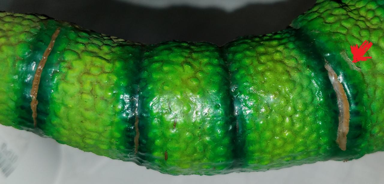 You can see on the far left is a rip that goes more than half-way around the tail.  The next joint to the right has a long crack that doesn't go all the way through the skin.  The next couple of segments have lots of little holes and cracks, then a big rip that is about a quarter of circumference.  Finally, we have a really big and ragged tear that reaches about two-thirds of the way all around the entire bottom side.