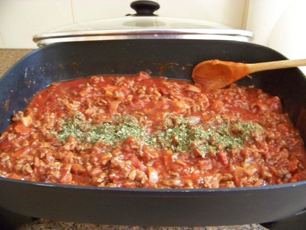 Add olive oil to frying pan. Heat to medium (no smoking up the house). Brown ground beef, Italian Sausage or pepperoni pieces.