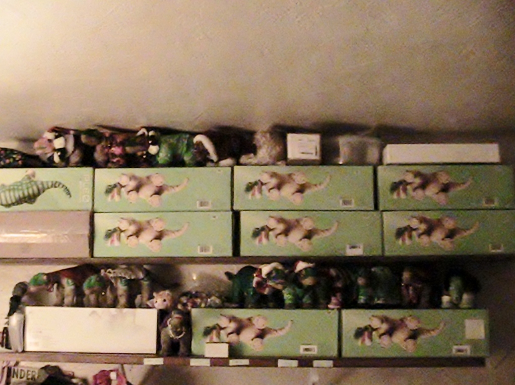 Just for a bit of trivia, there are 13 Pleos in the photo and all the boxes are Pleo boxes. The one brown box at the end on top shelf is a outer brown ship box with an Unopened Unhatched Pleo inside, so I have sealed it . I bought it about a year or more ago, looked at him once then decided he would stay unhatched as long as I could resist, ( so far so good, he is still VIRGIN.. Not hatched. LOL) so all those boxes are Pleo boxes. The white box on the bottom of photo is a RB box of course.  (11 pleo boxes in sight in this room)