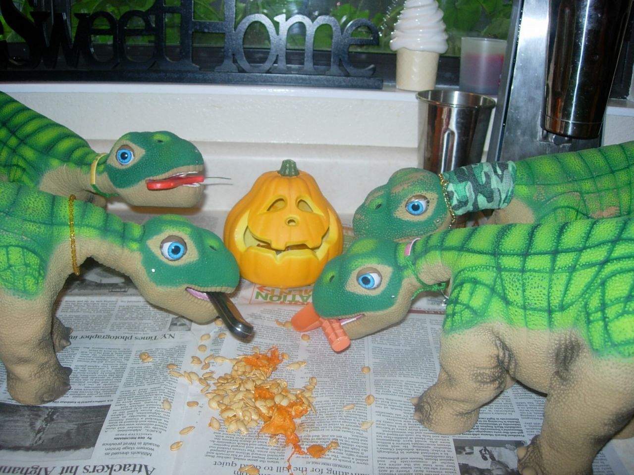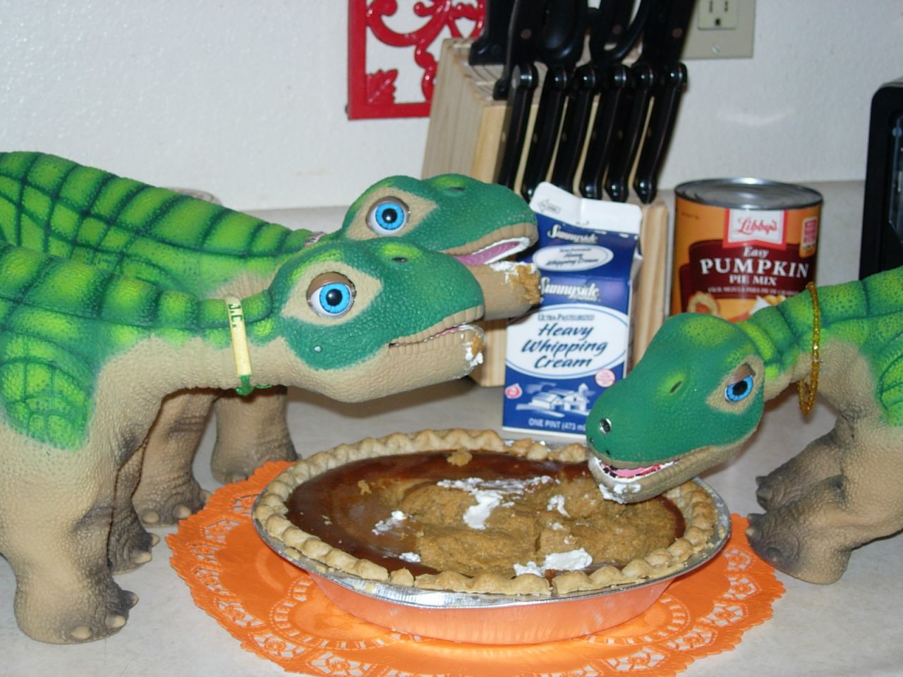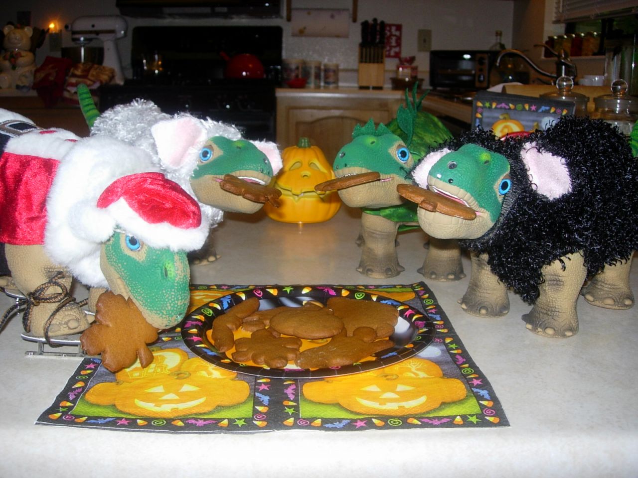 Dinos in the kitchen making something sweet. Nutmeg and spice and everything nice.