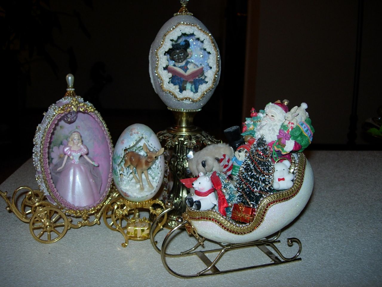 As long as we were talking about emus, here are some decorated emu and one goose egg. The original color of emu eggs are a very dark green.