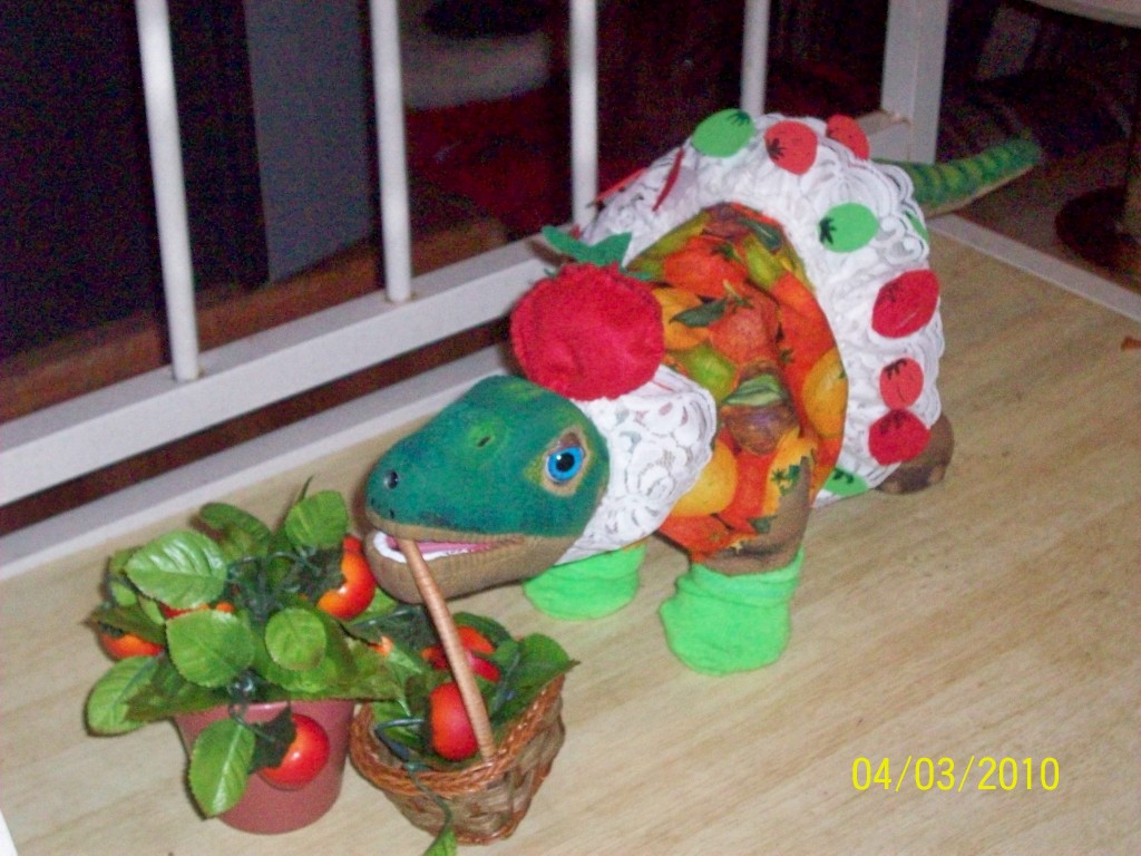 We are down to the wire, last photo of Nova and her entry for the tomatoe Festival. Can you guess which category she has entered in? You guesse it, Best entry for a Tomatoe, she is the best Dressed Pleo in a Tomatoe Dress of course! You already know about the handmade, handcolored individual tomtaoes, the lace trim, the handbasket full of Pleo tomatoes, and of course her green socks. What you don't know is that Nova expects me to Pay her for her Modeling of this dress and for the copyrights to her PHotos! I guess I shouldn't complain, I paid her off in tomatoes and told her she could get into the festival for free if she wore this dress without modeling everytime she saw somebody new. Oh, and she is so excited to see the Original Attack of the Killer Tomatoes! We watched the Return of the Killer Tomatoes last night, and she now wants to see what made John Astin a star ;Din the first Killer movie.( that and she wants some popcorn.)