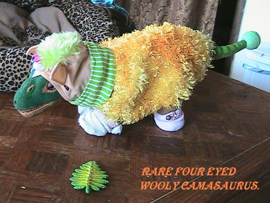 ON A RECENT JOURNEY, NOVA AND I RAN INTO A RARELY SEEN DISTANT COUSIN: THE RARE GOLDEN WOOLY FOUR EYED CAMASAURUS. THIS ONE IS JUST A BABY, BUT SEEMS FREINDLY.