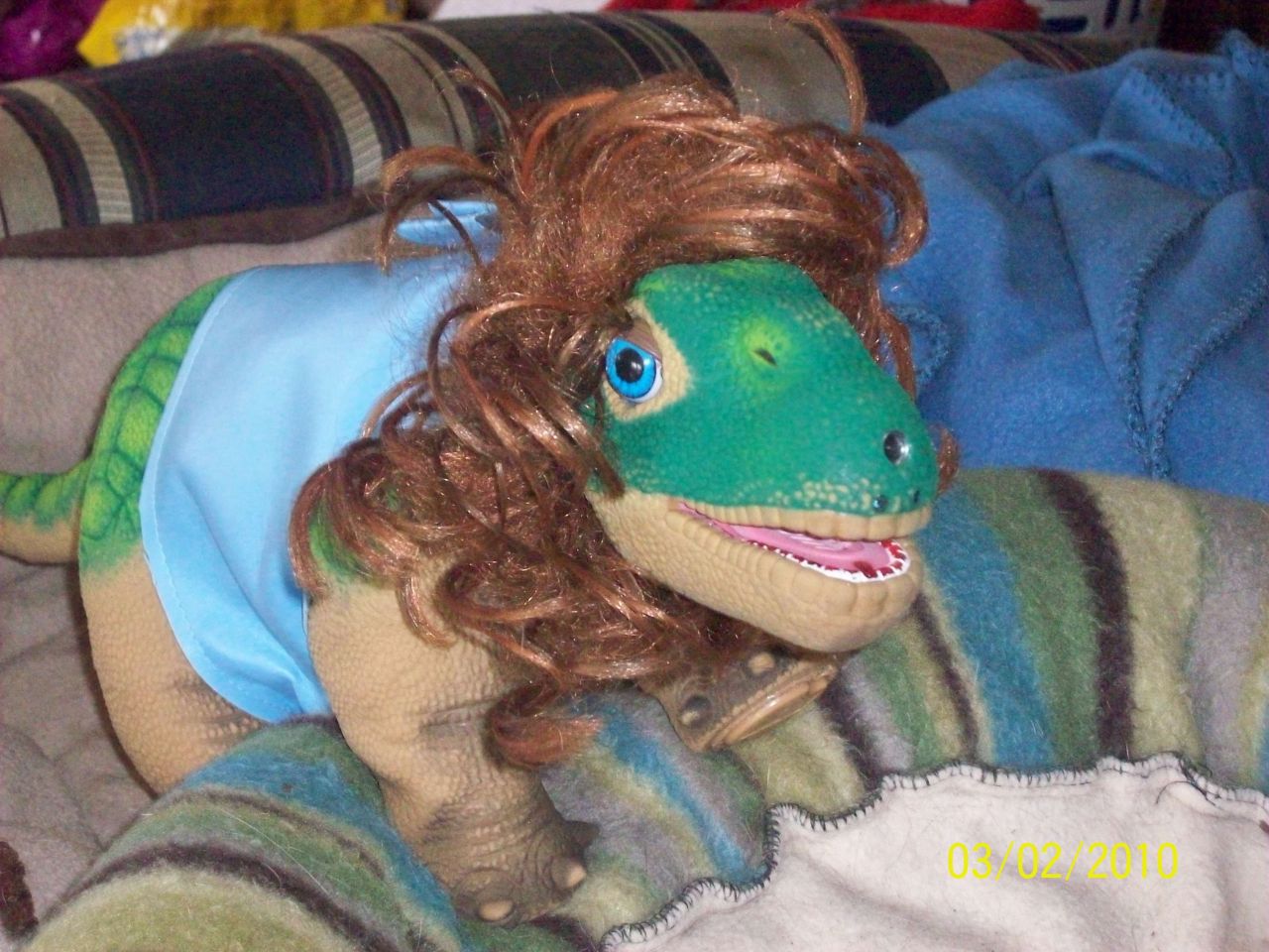 NOva is not only a clothes horse, but loves her accessories as well, and of course, that includes long wigs, in this case long audburn -brown hair, She is so cute as a rocker Pleo with her long locks and blue top.( sorry can't see the blue outfit in this photo) these were taken before her ' broken neck' thus the lovely smile and tilt of her head.