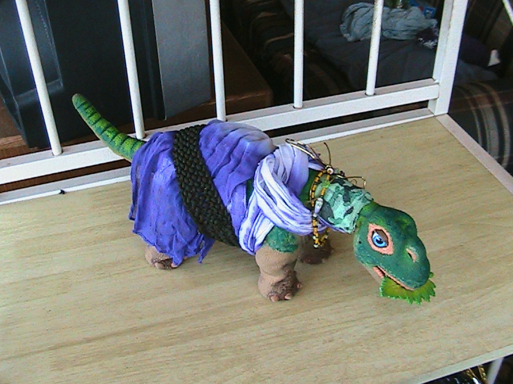 Here we have MS.Nova again with another one of the homemade outfits with no sewing required and objects found around the house. Nova likes this soft and long sweeping toga type dress with shades of purple and violet and a golden cord and simple necklace. The darker band at the rump area " holds' this work together artistcally.