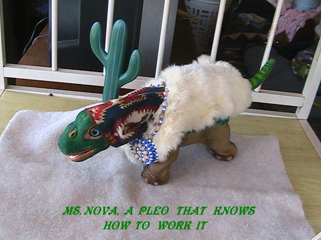 MS. NOva knows how to combine two different cultural ideas and combine the outfits to make it unique and her own, She is wearing a Southwestern style outfit combining a Mideastern look of a scarf, ( actually it is a Native American minature scarf, early 1900's ciggarette premium small cloth with native american design blanket on it,) genuine white rabbit fur ( from a doll I have) and a hand made Native American Seed Necklace on Leather to make a unique look. Of course the cactus in the background fits it alltogether. I like this look on NOva, ultra Chic and all her own.