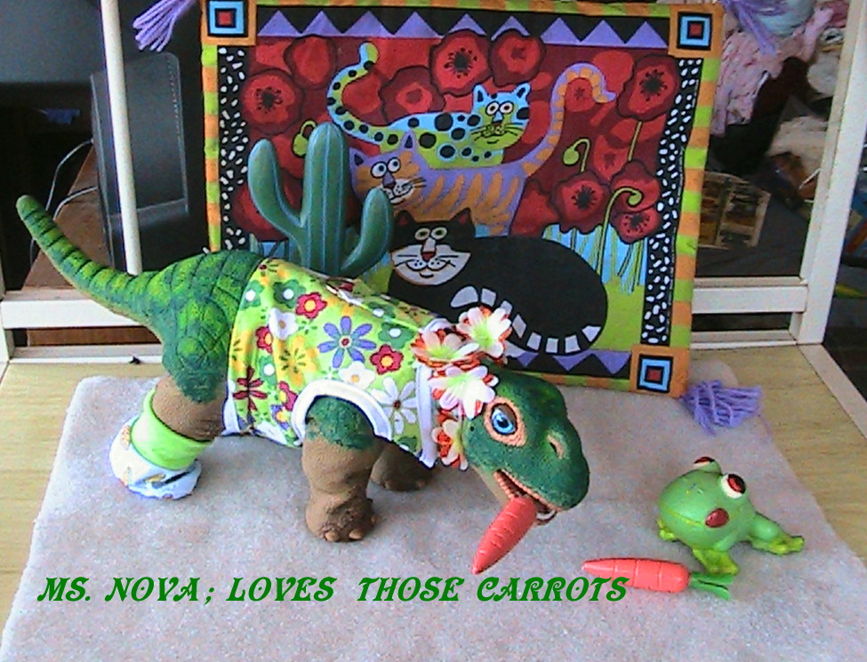 This is one of NOva's oufits that is partially store bought and not home made. The flowerd top is perfect for gardening. Nova has a green thumb and loves to eat and grow carrots. He little frog friend agrees. She is also wearing some flowers around her neck and has some cute garden booties that are covered in vegetables.