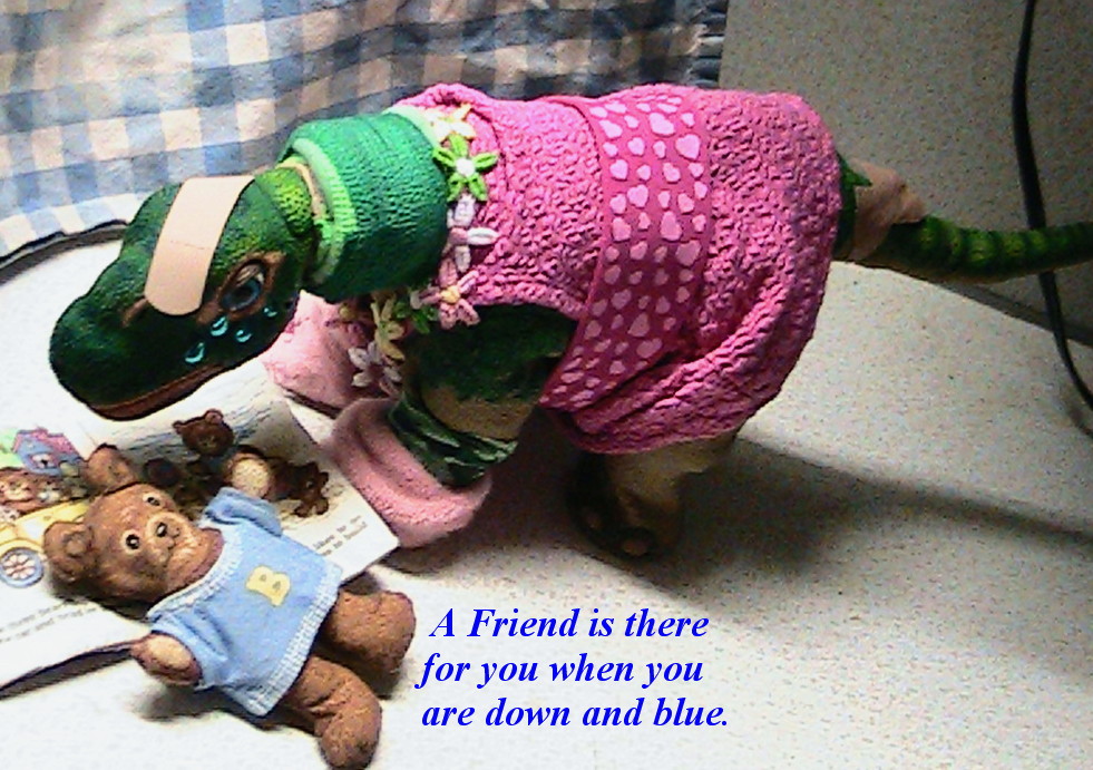 This is the one I really want with the text and brightness adjusted. Nova has been hurt, she has a bandage around one leg under her pink socks of course, and she allso hurt her neck of course, it is wrapped in thick green tape and a neck brace. She also bumped her little head, and the poor tail got stuck in a door! NO wonder she is crying blue tears. Her only friend that is there is her Teddy bear to try and cheer her up!