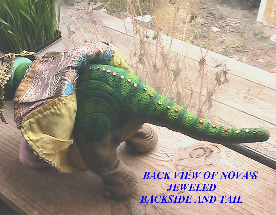 The yellow peasant skirt laced with purple that Nova is wearing is lifted back here so you can see some of the jewels on her back and tail. I woke up one day to see these jewels appearing out of nowhere on NOva's backside, tail and part of her face. I attempted to find out what happened, and all I was able to find out was that it had to do with the fact her neck has been injured, and somewhere a Special Needs Pleo Fairy Godmother gave her these little jewels to make up for all the physical pain she has been through . The more pain she goes through, the more jewels seem to appear on her back or elsewhere on her body. You may notice she does not have an entire back of jewels...