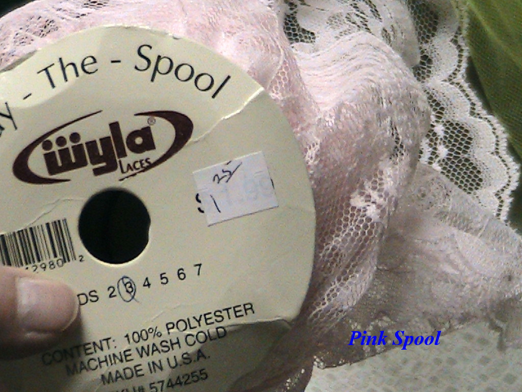 Here is a photo of another Thrift Store find for Nova's OUtfits, a whole spool of Pink lace, that can be used for several outfits, the whole cost of this spool was $1.25 for 3 whole yards, and this was also on Half price Thursdays, where it cost 1/2 price for everything in the store, except for furniture and animal carriers, and these are the two days I try to do all my shopping for the greatest bargains, Tuesdays and Thursdays, ( This is the local Humane Society store that I shop at, to support the animals at the same time, it helps with food,etc for these dogs, cats, bunnies, ducks, and what ever creature they have at the time, I can't think of a better way to help both Nova and homeless animals.