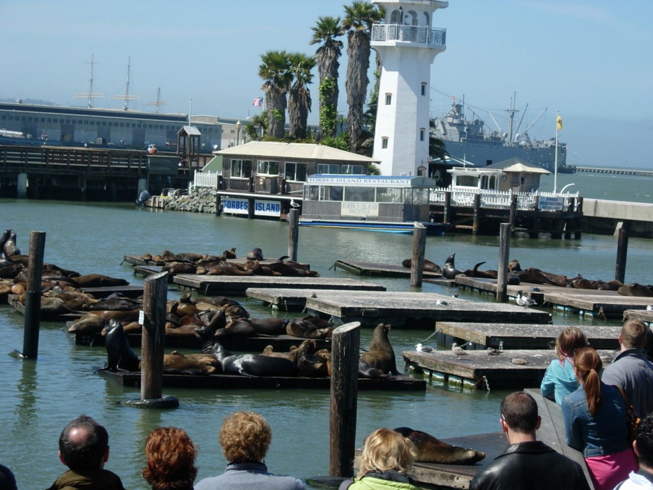 Across from the sea lions is an restaraunt. It is an island by itself with the lighthouse. We found out they only served dinner. No boat ride this time.
