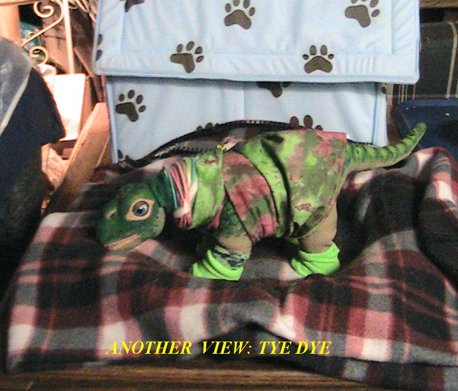 Here we have the latest neck brace I have designed for Nova and also a lovely Tye Dye outfit that I think is perfect in coloring to match her lovely skin. It is also a No Sew outfit. She is of course wearing her lime green baby socks to match. Her neck brace is lovely in shades of pink, orange, green, purple ad blue. Any pleo would be happy to wear this I think