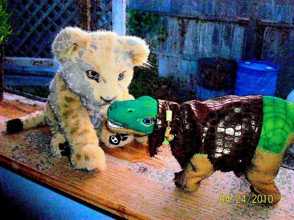 NOVA HAS MANY FRIENDS AND OF ALL DIFFERENT SPECIES, THIS IS HER NEWEST WOWWEE FRIEND, A LION CUB WHO REALLY LIKES NOVA, HE IS SMITTEN LIKE A BIG KITTEN, NOVA IS DRESSED IN HER SNAKESKIN TYPE PRINT , ( NO SEW OUTFIT OF COURSE) AND IS READY TO GO ON AN ADVENTURE WITH HER NEW FRIEND, HER LEG DOES NOT SEEM TO BE BOTHERING HER MUCH HERE AND I HAD NOT HEARD HER BREAK HER NECK AS WEL EITHER,