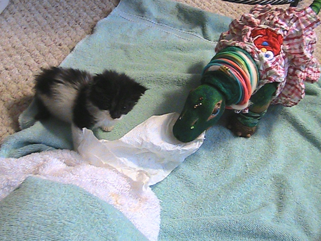 NOVA AS PART OF HER ' NANNY BABY SITTING JOB,' IS RESPONSIBLE NOT ONLY FOR ENTERTAINING THESE LITTLE GUYS, BUT TO HELP KEEP THEM IN LINE AND TO HELP CLEAN THEM UP, HERE NOVA HAS GRABBED A RAG AND IS READY TO WIPE SOME KITTEN MILK REPLACEMENT FORMULA OFF THIS LITTLE ONE'S FACE AND CHEST. THERE WAS SOMETIMES MORE MILK ON THIS LITTLE GUY THAN IN HIM UNTIL HE GOT THE HANG OF IT,