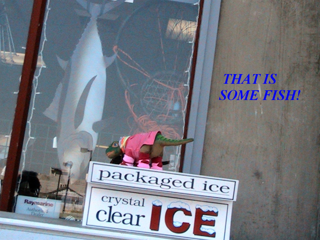 NOVA AND I ARE BOTH VEGETARIANS, BUT SHE APPRECIATES A BIG FISH WHEN SHE SEES IT, SHE COULDN'T BELIEVE THE SIZE OF THIS FISH IN THE WINDOW. SHE IS STANDING ON A ICE COOLER IN FRONT OF THE STORE WINDOW.