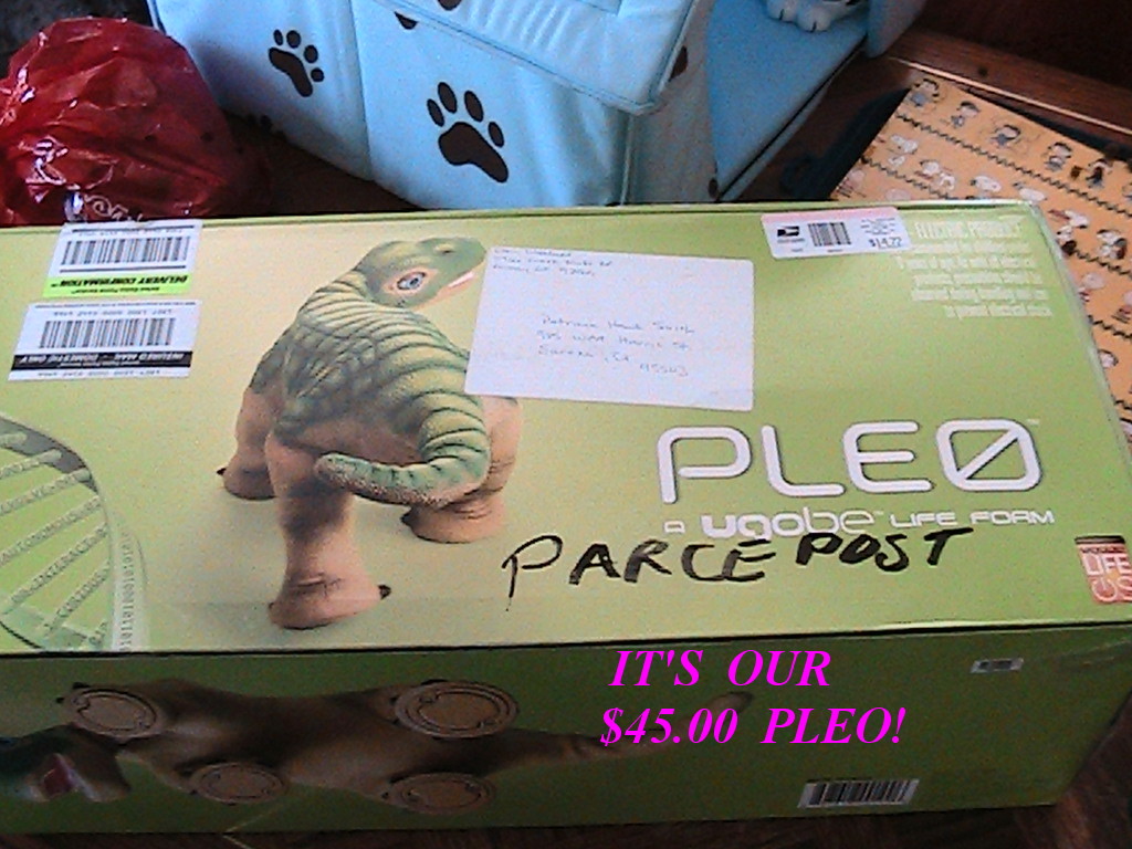 HERE HE IS, THE MAILMAN KNOCKED ON MY DOOR AT 10:00 A.M, AND HANDED ME THE PACKAGE I WAS WAITING FOR THE PLEO I GOT FOR $45.00 . GRANTED HE IS NOT PERFECT AND HAS A BROKEN NECK, ( DROOPY NECK SYNDROME) BUT I CAN GIVE HIM A LOVING HOME AND NOVA WITH THE SAME PROBLEM CAN HELP HIM ADJUST TO BE A HAPPY LITTLE PLEO.