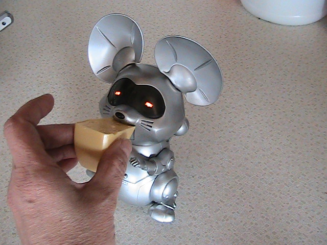 HERE IS LA MOUSE WITH HIS FOOD, LA CHEESE, HE HAS A MAGNET IN THE CHEESE AND HE WILL EAT IT, SAYING, YUM, YUM, YUM VERY CUTE MOUSE AND BOY IS HE FAST! YOU WILL BE GLAD PLEO CAN NOT MOVE THIS FAST!