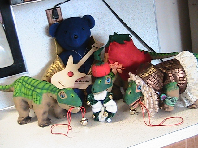 Here we have the Pleo Trio, Nova and Brothers, with their special Guest, Elvis Teddy Bear, in his Golden Jump suit, he is adding his voice and guitar talents. The Pleo trio are lucky to have Tomatoe fresh from the Weedovia Tomatoe patch and he is still able to shake his tambourine and not get any ' sauce all over,"