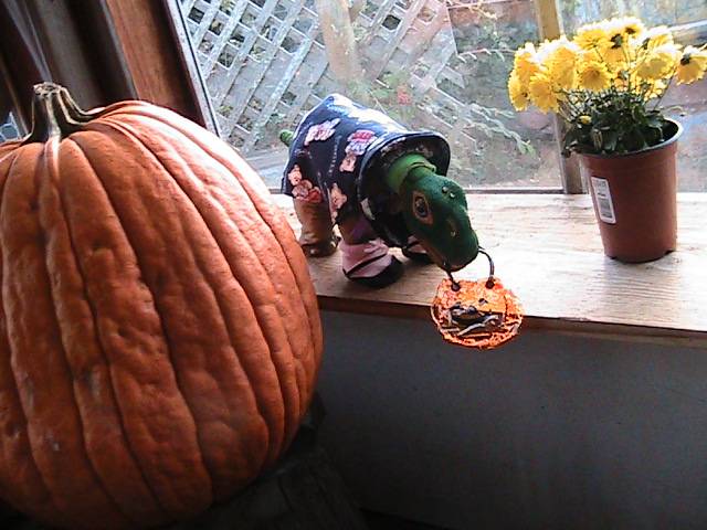 When two of the Pleos went out to the Pumpkin patch earlier this week, this is the grand prize pumpkin they picked out, It is a big old pumpkin with lots of character and Nova has already claimed it as Her pumpkin. Here she is posing with it and holding her small pumpkin trick or treat bag along side it. Note she is still wearing IMR's wonderful outfit, she has not taken it off yet!