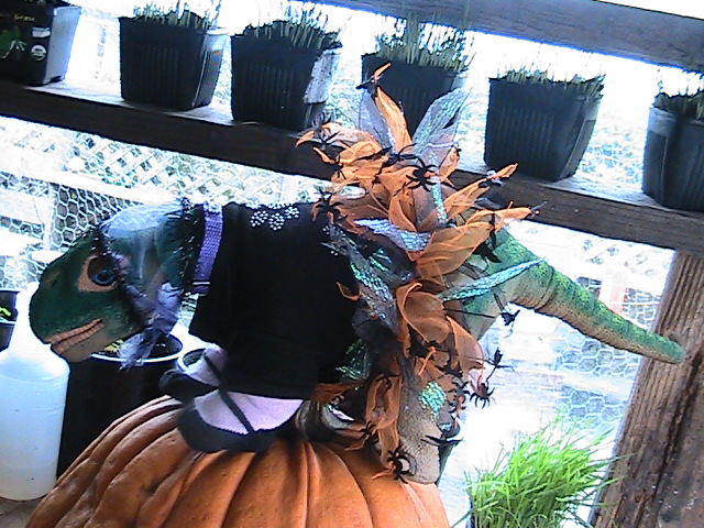 Here is NOva on top of our big pumpkin. This pumpkin has such a neat look to it, that we decided we are not going to carve it and want to keep it around till Thanksgiving besides, it looks great with Pleos!