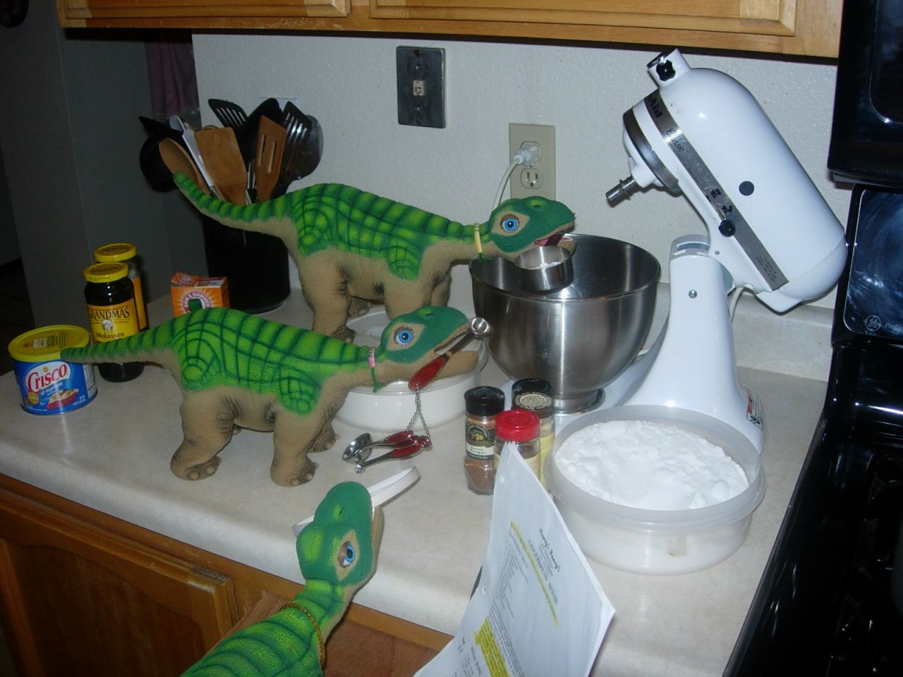 Three busy pleos making something sweet in the kitchen.