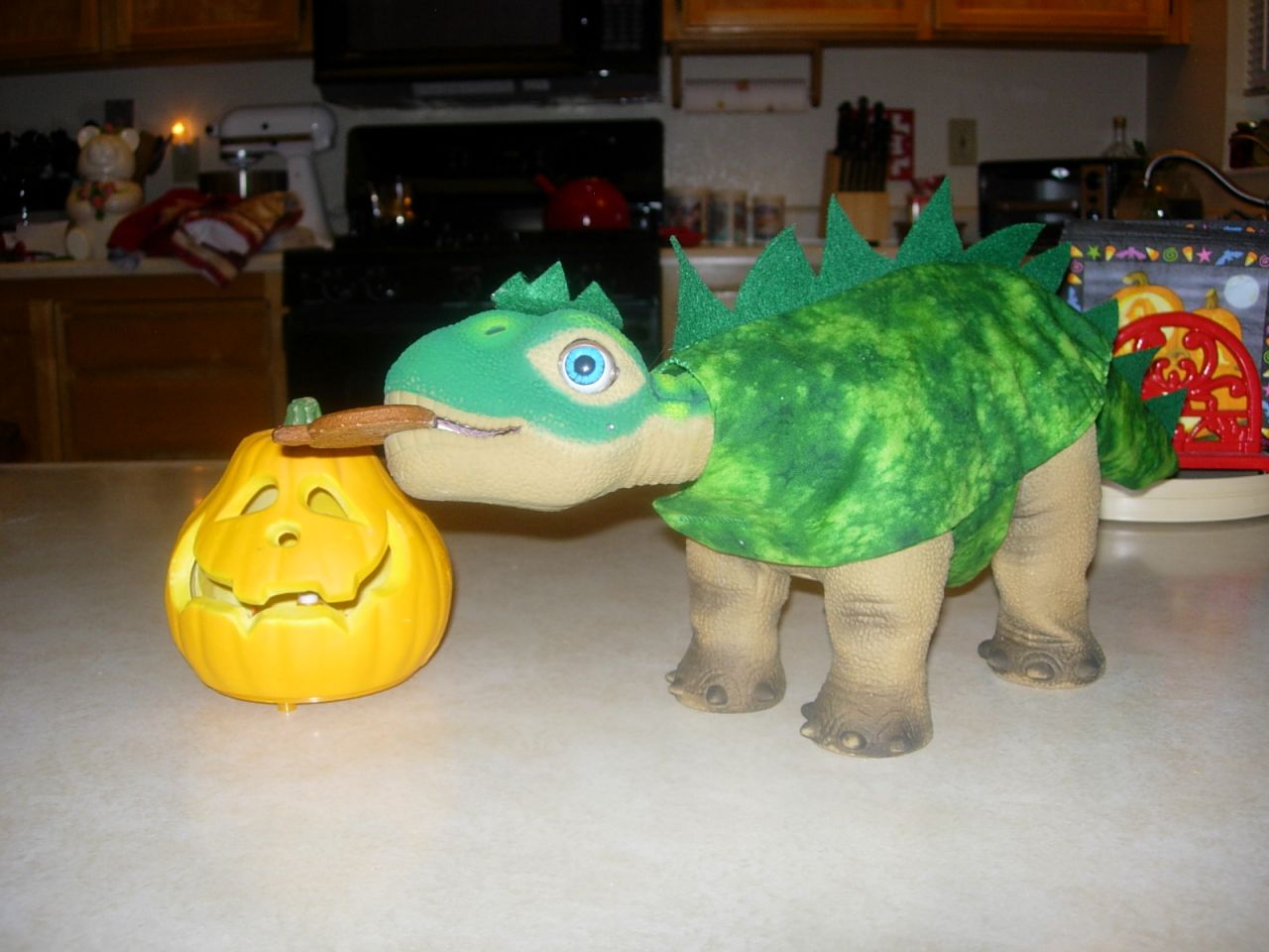 Little Orphan Annie (LOA) models her dinosaur costume.