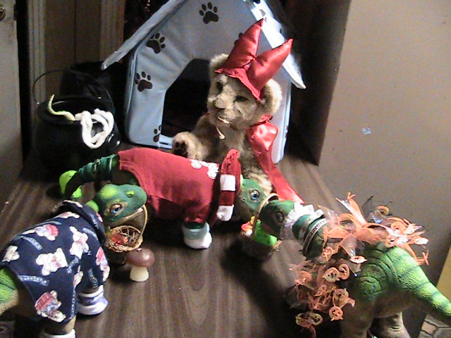 Here Little 45, Major and NOva have stumbled upon the home of Devil CAt, he is after all wearing a Red cape and has red horns and has terrible claws and mean jaws as it says in verse #11, and they are Terrified of him. There is even a cauldron in the photo with the remains of what looks like a lizard hanging out and a snake on the ground, These Pleos better watch their step here!