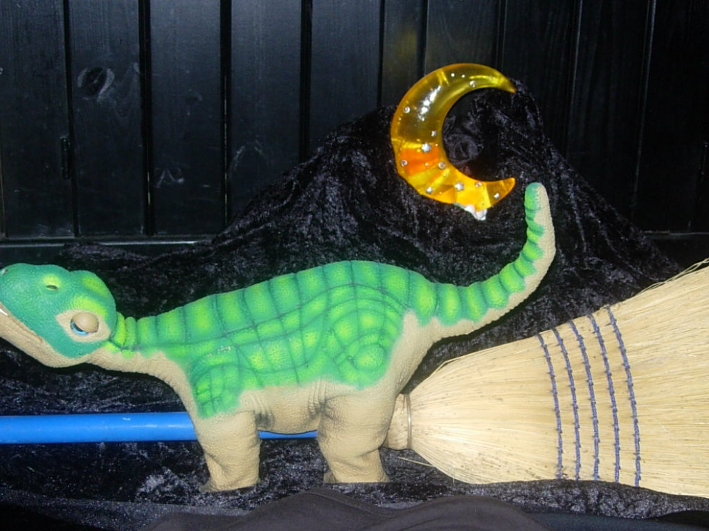 Baby, the pleo, trying to take a flight to the moon on a broom.