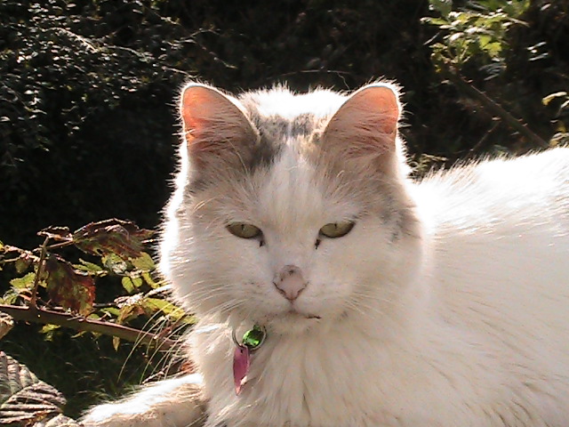 My lovely April Cat again, outside sitting in the sun just exactly where she thinks a cat belongs. She is a Pastel Calco and very delicate and a quiet little peeper , you can barely hear her . She allways has a dirty nose from digging in the dirt and flowers.