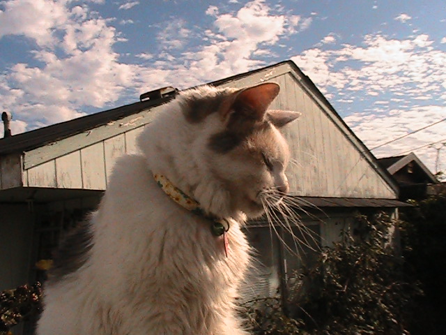 This is my favorite photo of this bunch that I took on this day, I kept snapping photo after Photo and at long last I got the photo I really wanted, The sky and clouds are perfect and April is purrfection, I could not ask for anything else in this photo . She looks quite serene and peaceful in this photo, As any photographer knows amatuer or professional, it takes lots of photos till you get the one you want and sometimes you still dont get the one you want, but when you do , you know it!