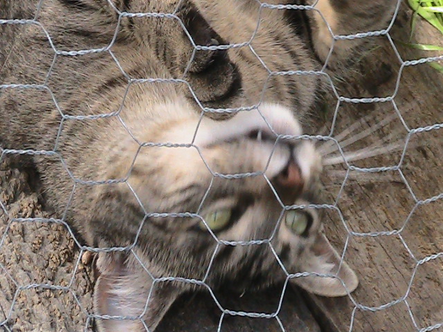 Suzzette, or Suzy Q as I like to call her, is upside down in the window box surrounded by chicken wire to prevent a cat from getting out on our back yard deck. Some of our cats are luck enough to get to go out, since we live on such a very busy street, and even though our yard is completly blocked off with a tall fence and chicken wire on top of that, I know if a cat wants out bad enough, they will look for a way to get out of the yard. This is our little female Brown tortie, Suzy Q, she is the mother want to be.( they are all neutered and spayed