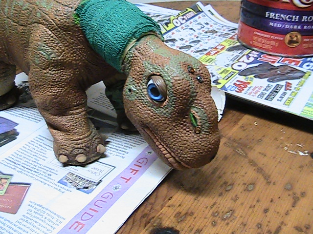 I was experimenting with a Pleo of myne,and here the pleo is brown with some green showing, the Pleo kept getting referred to by my husband as " chocolate Pleo", or " the Pleo with a suntan", and I got upset he kept giving me a hard time with my experiment. I wanted to see what colors would look like and before I could go on with the next step in the project, I just removed all the paint, but I did take some photos and video for memories.
