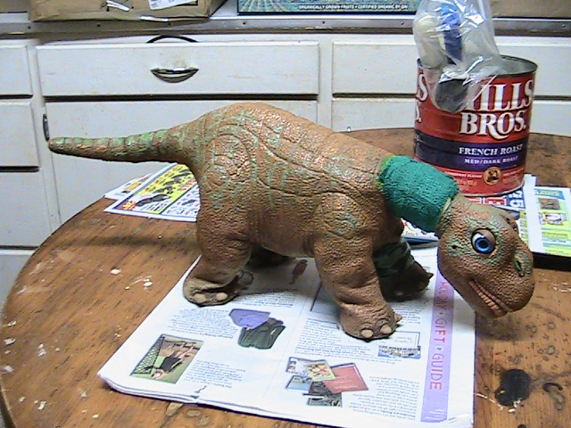 Same Pleo, just begginning of green marks added to body at certain points, At some point I was getting ready to add the fine details with the spray instrument small small dots and detail that can not be done with a brush and it wont look like a brush either which is the whole point of not using a paint brush. This Pleo was only about 20% done with the paint job, so save your final thoughts as it never got to be finished...someday I will do it again and carry it out to completion without my husband's comments and like the old saying goes, " too many cooks spoil the soup", Besides he is a stained glass artist, and not an Pleo painter, neither am I but I am adventuresome and curious!